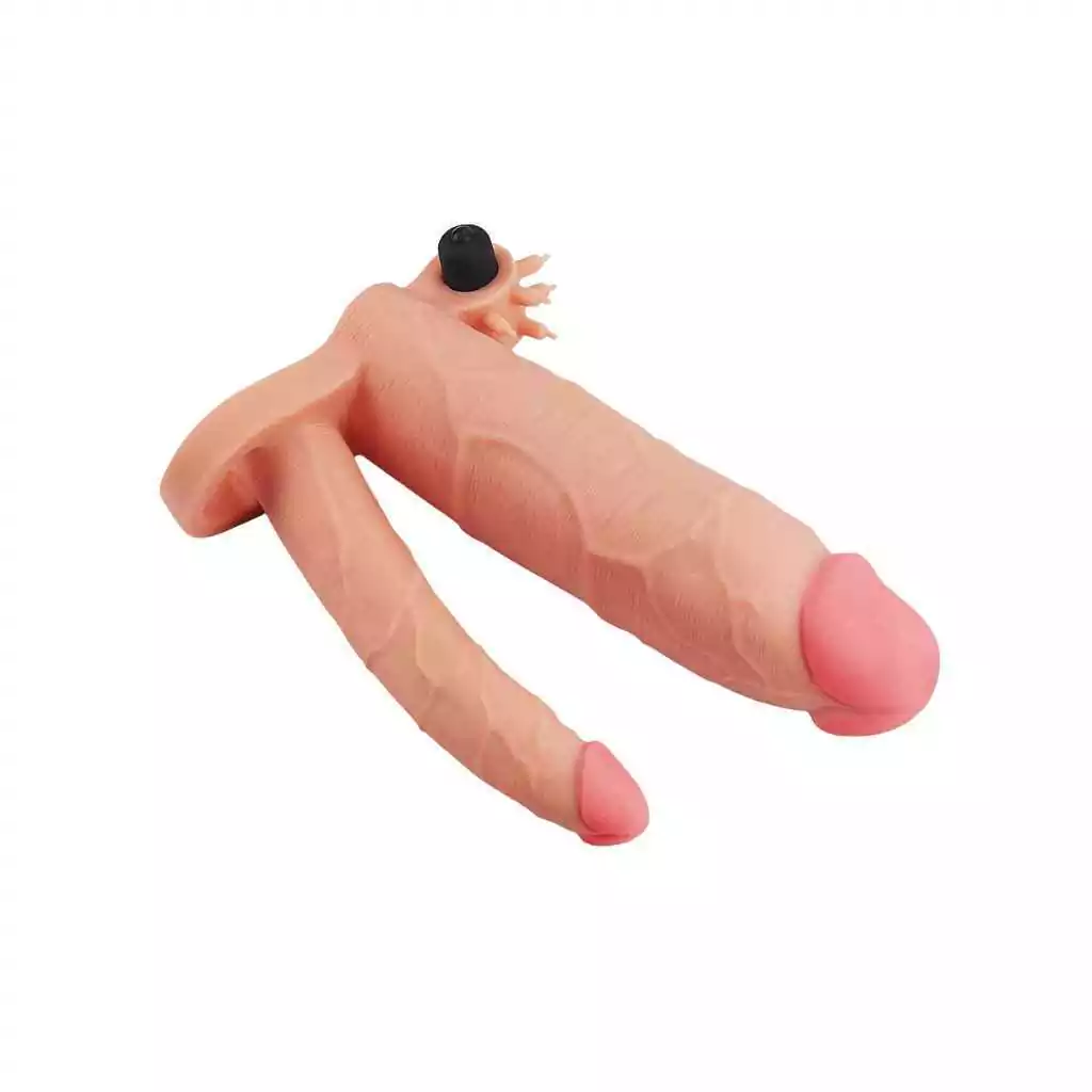Capa peniana com extensor de 5 cm, com estimulador de clitóris e cápsula vibratória. Possui pênis para dupla penetração e anel para escroto. Possui relevos salientes em formato de veias e glande.
